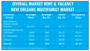 New Orleans is still enjoying an overall occupancy rate of 92.2 percent. Individual occupancy rates for various areas are: 93.2 percent in New Orleans Historic Center; 92.5 percent in Garden Apartments (Jefferson Parish); 87.9 percent in St. Tammany Parish; and 92.3 percent in Orleans Parish. Despite metro New Orleans’ overall increase in vacancy, these numbers are significantly higher than rates in many other metro areas.