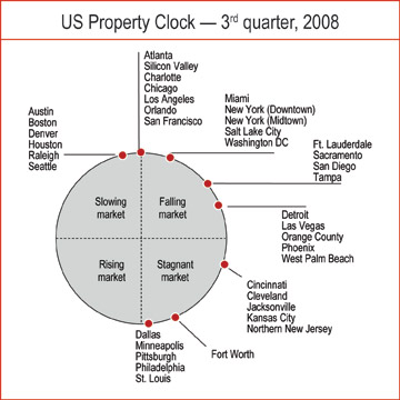 In the midst of the current financial crisis and the uncertainty surrounding the collapse of large banking institutions, the office market faces many of the same pressures other commercial real estate markets have been going through. Unfortunately, brokers don’t see the office market changing any time soon. Most likely, the market will regain its luster exactly the same way it became stagnant: gradually. Jones Lang LaSalle just released its third quarter U.S. office property clock, which illustrates the relative health of office markets around the nation. All the major cities in the Southeast — from Atlanta to Charlotte to Miami — are either held hostage by a falling market or are experiencing development stagnation. In a measure of how economic troubles are affecting the entire nation, Jones Lang LaSalle rates none of the major U.S. cities as being in a rising market.