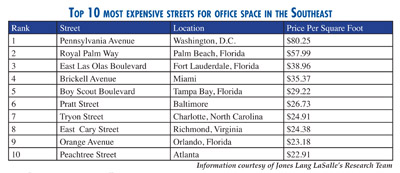 A look at the top 10 most expensive streets for office space in the Southeast. Savannah Duncan